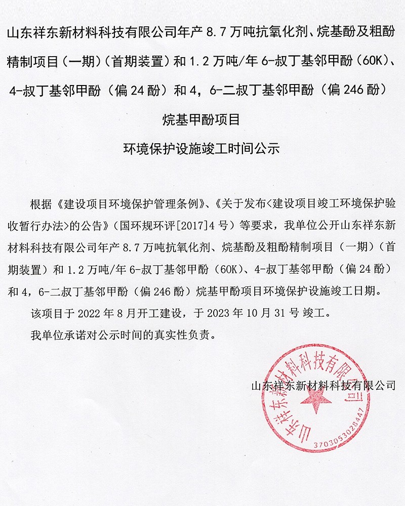 烷基甲酚項目環(huán)境保護設施竣工時間公示