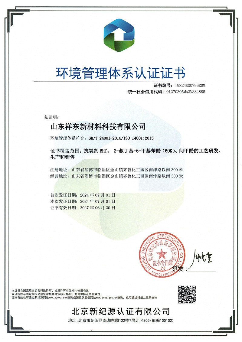 山東祥東新材料科技有限公司1.2萬噸/年6-叔丁基鄰甲(60K)、4-叔丁基鄰甲酚(偏 24 酚)和 4,6-二叔丁基鄰甲酚(偏 246 酚)烷基甲酚項目竣工環境保護驗收監測報告